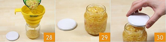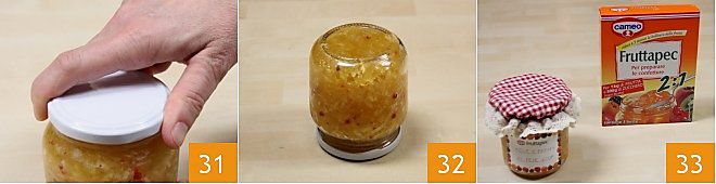 apretando bien y asegurándose de que estén herméticamente cerrados 31. Voltee los tarros aún calientes durante 5 minutos, de esta manera se creará el vacío y también se esterilizarán las tapas 32. Su confitura de manzanas y naranjas con pimienta rosa está lista: una vez que haya alcanzado la temperatura ambiente, recuerde etiquetar el tarro para que sea reconocible 33.