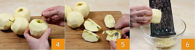 quite el tallo 4, córtelas en cuartos y elimine, con un cuchillo pequeño, también el corazón interno 5. Con un rallador de agujeros grandes, ralle las manzanas 6,