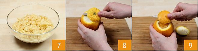 recogiéndolas en un bol grande 7. Pele ahora las naranjas, cortando con un cuchillo pequeño los dos extremos (8-9);