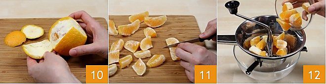luego, incidiendo la piel a lo largo, sin tocar la pulpa, pélelas completamente 10. Divida las naranjas en gajos y corte cada gajo por la mitad 11. Consiga un pasapurés de agujeros grandes y colóquelo sobre un bol grande, para recoger el jugo y la pulpa de la fruta; vierta los gajos de naranja en el pasapurés 12