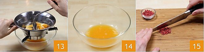 y páselos girando suavemente 13, para exprimir todos los gajos 14. Pique finamente 1 cucharada de pimienta rosa con la ayuda de un cuchillo bien afilado 10; como alternativa puede usar un mixer.