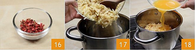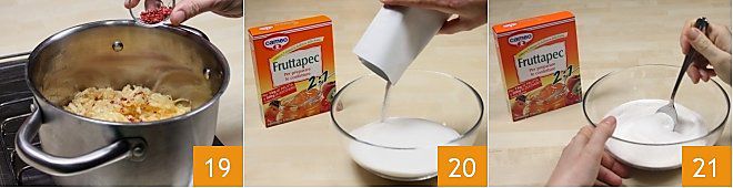 finalmente añada la pimienta rosa, tanto la picada como los granos enteros 19. Estas operaciones deben realizarse con el fuego apagado. En un bol coloque 500 g de azúcar granulado y añada 1 sobre de Fruttapec 2:1 20 y luego mezcle los dos ingredientes con una cuchara 21.