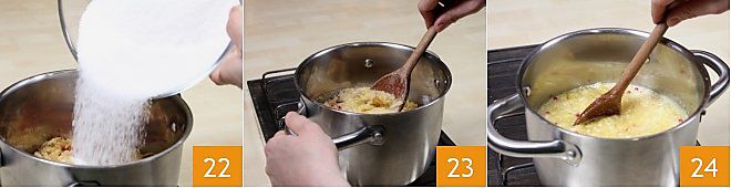 Añada el azúcar con el Fruttapec en frío a la fruta, directamente en la cacerola 22. Lleve la mezcla a ebullición, manteniendo el fuego alto y continuando a mezclar para que no se pegue al fondo 23. Cuando la mezcla haya alcanzado la ebullición, deje hervir durante 3 minutos a fuego fuerte, siempre mezclando 24.