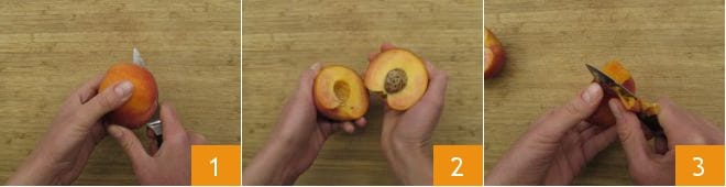 Para preparar la confitura de melocotones al horno, lo primero es asegurarse de tener tapas nuevas y tarros sanitizados (siguiendo las indicaciones del Ministerio de Sanidad que se encuentran al final de la receta). Luego, lavad los melocotones, divididlos a la mitad utilizando un cuchillo 1 y separando las dos mitades 2 extraed el hueso. Después, peladlos 3.