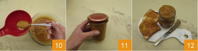 Llenad los tarros 10 y cerradlos enroscando bien la tapa 11. Luego, dad vuelta al tarro y dejad que se enfríe completamente. Si la confitura está aún caliente, el vacío se creará automáticamente, de lo contrario, para mayor seguridad, podéis colocarlos en una olla con agua (a unos medio cm de la tapa) y llevar todo a ebullición. Antes de consumir 12, aseguraos de que el vacío se haya creado presionando la tapa en el centro: si hace clic-clac significa que el vacío no se ha realizado correctamente y la confitura no se puede consumir.