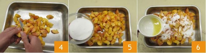 y cortándolos en trozos, transferidlos dentro de una bandeja de horno 4. Agregad el azúcar 5 y el jugo de limón 6.