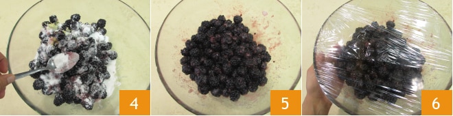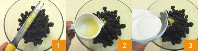 Para preparar la confitura de moras, primero asegúrate de tener tapas nuevas y tarros esterilizados (siguiendo las indicaciones del Ministerio de Salud que se encuentran al final de la receta). Lava y seca delicadamente las moras, luego colócalas en un bol grande y añade la cáscara 1 y el zumo del limón 2. Añade también el azúcar 3.