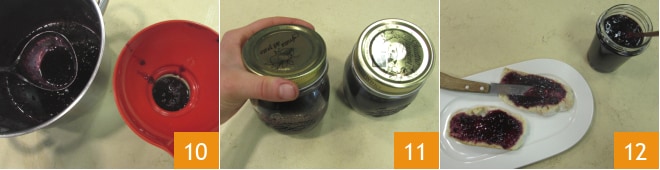 Transfiere la confitura aún caliente a los tarros previamente esterilizados ayudándote con un embudo 10 y ciérralos enroscando bien la tapa 11. Voltea los tarros y déjalos enfriar completamente, luego verifica que se haya creado el vacío: si la tapa en el centro hace click-clack significa que no se ha creado el vacío y la confitura no se puede consumir. Deja reposar la confitura de moras por al menos una noche antes de usarla 12.