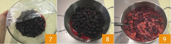 Transcurrido el tiempo de maceración, las moras habrán soltado su jugo 7, entonces transfiere todo a una cacerola 8 y cocina a fuego medio-bajo hasta que la mezcla alcance la temperatura de 108°, a medir con un termómetro de cocina 9.