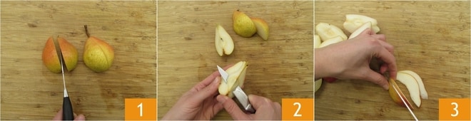 Para preparar la confitura de peras y canela, lava bien todas las peras. Córtalas en gajos 1 y elimina el corazón central 2, luego córtalas en rodajas finas, de aproximadamente 0,5 mm 2.