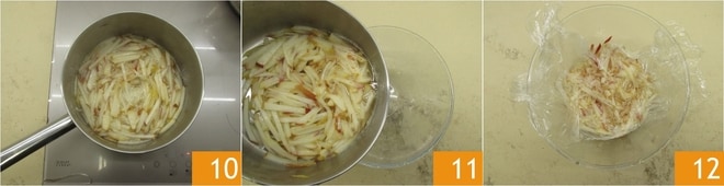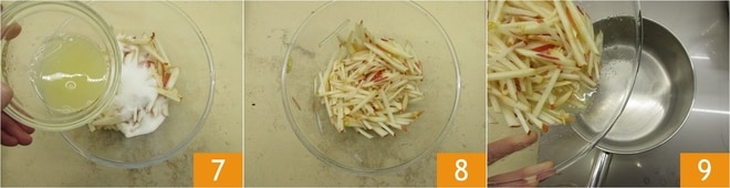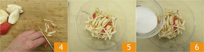 Corta las rodajas en juliana 4. Transfiere los bastoncitos de pera a un bol 4 y añade el azúcar 5.