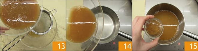 Pasado este tiempo, saca las peras de la nevera y cuélalas para separar la fruta del agua de vegetación 13 que verterás en otro cazo 14. Calienta a fuego moderado y añade la canela 15.