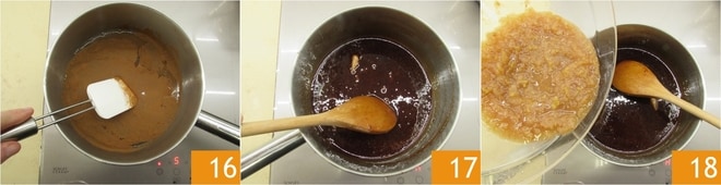 Mezcla bien hasta que se haya disuelto 16 y continúa cocinando hasta que el jarabe alcance una temperatura de 105°. En este punto, añade las peras 18.
