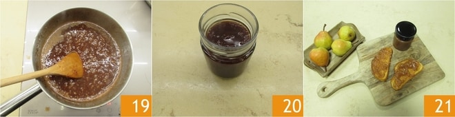 Mezcla bien y vuelve a llevar a ebullición 19. La confitura de peras y canela está lista, transfiérela a los tarros 20, déjala enfriar y disfrútala 21. Si quieres usarla inmediatamente para preparar la tarta, basta con verterla en un bol y dejarla enfriar.