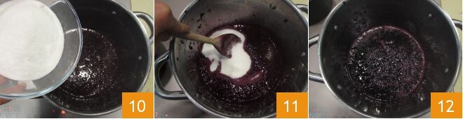 Volved a poner todo en la cacerola, añadid el azúcar 10, mezclad 11 y coced a fuego lento hasta que hayáis alcanzado una temperatura de 108° (esto llevará unos 20 minutos, recomendamos usar un termómetro de cocina) 12.