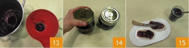 Transferid la conserva aún caliente en los tarros previamente esterilizados ayudándoos con un embudo para un trabajo más preciso (nosotros hemos usado tarros de 300 g) 13 y cerradlos 14 asegurándoos de crear el vacío (si la tapa en el centro hace click-clack una vez que la conserva se haya enfriado, significa que el vacío no se ha creado y la conserva no se puede consumir). Vuestra conserva de uva negra se podrá consumir después de aproximadamente 2-3 semanas de haberse hecho 15.