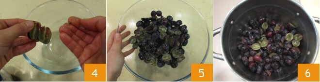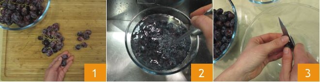 Para preparar la conserva de uva negra, aseguráos de tener tapas nuevas y tarros esterilizados (siguiendo las indicaciones del Ministerio de Salud mencionadas al final de la receta). Luego comenzad separando las uvas del racimo 1, lavadlas cuidadosamente bajo agua corriente 2, escurridlas y quitadles las semillas internas abriendo cada uva con un cuchillo pequeño 3