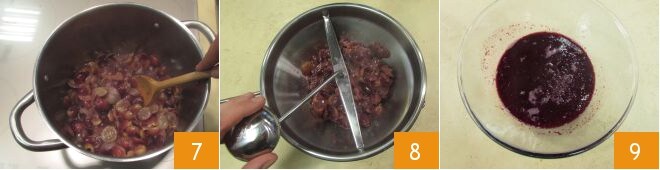 y dejadlas deshacerse a fuego medio durante unos 20 minutos, cuidando de remover 7. Una vez lista, retirad del fuego y pasad la uva por el pasapurés 8, extrayendo así el jugo y parte de la pulpa 9.