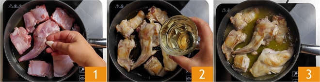 Para preparar el conejo en sartén, primero vierta el aceite en una sartén antiadherente, coloque los trozos de conejo y agregue el ajo con piel 1. Dore, a fuego vivo durante unos minutos, ambos lados de la carne, luego rocíe con vino blanco 2 y deje evaporar toda la parte alcohólica 3.