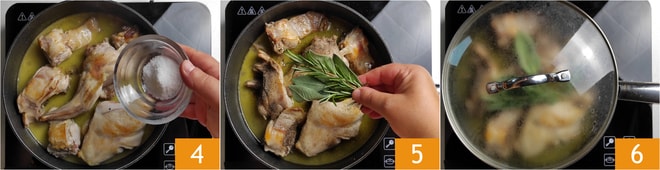 Ajuste de sal y pimienta 4, luego agregue algunas hojas de salvia y unas ramitas de romero 5. Cubra con tapa 6 y cocine, a fuego lento, durante 30 minutos.