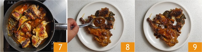 Cuando la carne esté cocida, retire la tapa, agregue medio vaso de agua y continúe cocinando durante otros 10 minutos, o hasta que se forme un fondo de cocción lo suficientemente espeso 7. Emplate y agregue a la carne una generosa cucharada del fondo de cocción 8. El conejo en sartén está listo para ser servido 9.
