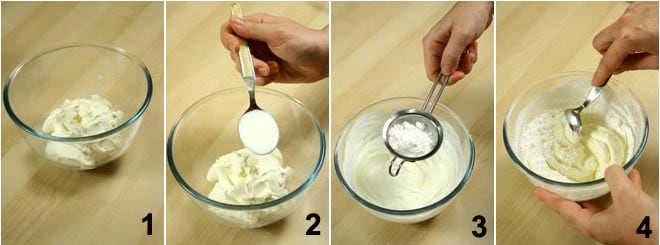 En un bol ablanda el mascarpone añadiendo 2-3 cucharadas de leche (1-2), luego añade el azúcar glas 3, el extracto de vainilla y mezcla bien todos los ingredientes 4.