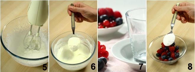 En otro bol monta la nata 5 y añádela a la mezcla de mascarpone 6. Luego coloca la mezcla en las copas y ponlas a enfriar en el frigorífico 7. Mezcla los frutos del bosque con 50 gr de azúcar y el jugo y la ralladura de 1 limón: mezcla delicadamente y déjalos macerar 8. Saca las copas del frigorífico y adórnalas con los frutos del bosque, variando con el jugo de los mismos frutos.