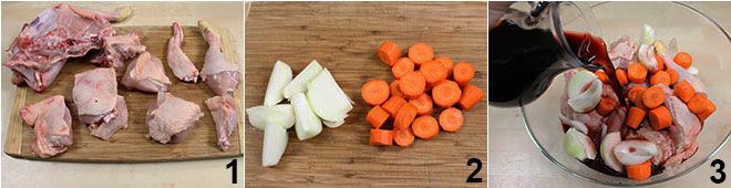 Para preparar el coq au vin, toma el pollo y córtalo en trozos 1 siguiendo las indicaciones que encuentras aquí (cómo cortar el pollo). Corta la cebolla en gajos y las zanahorias en rodajas 2. Pon el pollo cortado en un recipiente bastante grande, añade la zanahoria, la cebolla, el vino tinto hasta cubrirlo completamente 3.