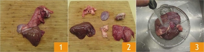 Para preparar la coratella, toma las vísceras de cordero 1 y utiliza un cuchillo para separarlas, quitando también el exceso de grasa. Para la receta necesitarás: 120 g de corazón, 180 g de pulmón, 350 g de hígado, 100 g de bazo y 100 g de exceso de grasa 2. Transfiere todo a un colador y lava bien las vísceras 3.