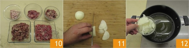 Repite la misma operación para todos los trozos, cuidando de separarlos en diferentes boles 10. Ahora pasa a las cebollas, pélalas y córtalas en rodajas 11. Vierte en una cacerola el aceite, añade las cebollas 12