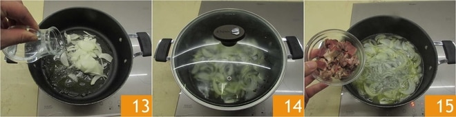 y medio vaso de agua 13. Sala, cubre con una tapa 14 y deja pochar la cebolla hasta que esté bien tierna. Cuando la cebolla esté bien tierna, añade los trozos de corazón 15 y mezcla.