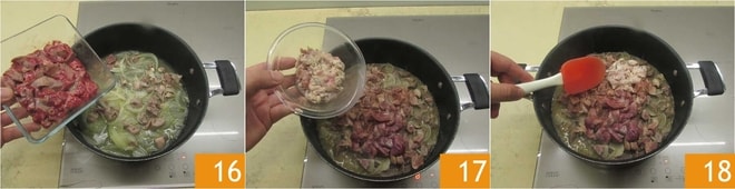 Espera unos minutos, luego añade también los trozos de pulmón 16 y mezcla de nuevo. Al ser más duros, necesitan unos minutos más de cocción. Luego añade el resto 17 y mezcla de nuevo 18.