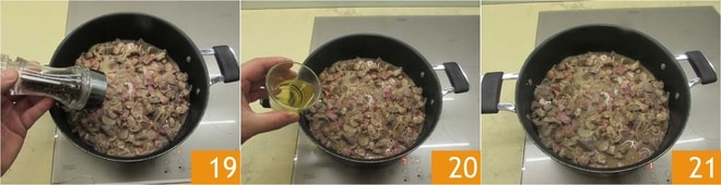 Sala, añade pimienta 19 y rocía con vino blanco 20. Cuando la parte alcohólica se haya evaporado 21,
