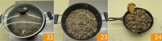 cubre con una tapa, dejando un pequeño espacio 22 y cocina durante 25-30 minutos 23. Sirve entonces la coratella aún caliente 24.
