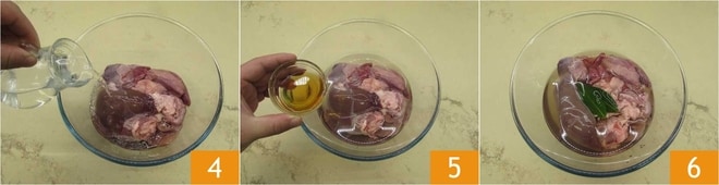 Transfiere a un bol y cubre con agua 4, nosotros hemos utilizado 250 g. Añade también el vinagre 5 y las hojas de laurel 6.