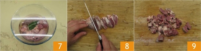 Cubre con film transparente 7 y espera un par de horas. En este punto toma un trozo de las vísceras y córtalo primero en rodajas 8 y luego en cubos 9.