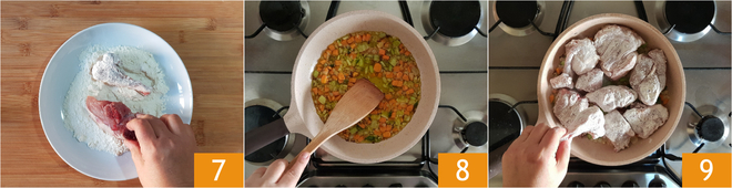 Enharina ligeramente los trozos de cordero 7, sacúdelos para quitar el exceso de harina y cuando las verduras estén bien sofritas 8 añade también el cordero en la cacerola 9.
