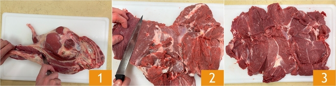 Para preparar el cordero relleno, empezad abriendo por la mitad la pierna deshuesada por el lado largo del hueso 1, luego practicad cortes en las partes más gruesas de la carne abriéndolas lateralmente (como un libro), sin separarlas completamente del resto de la pieza 2. Si algunas zonas siguen siendo demasiado gruesas respecto a otras, haced pequeños cortes horizontales y estirad la carne hacia afuera, de modo que quede una capa uniforme para enrollar 3.