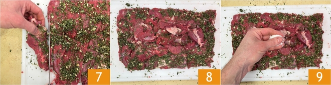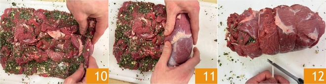 Enrollad la carne desde el lado corto 10 formando un rollo 11. Atad el rollo obtenido con hilo de cocina 12.