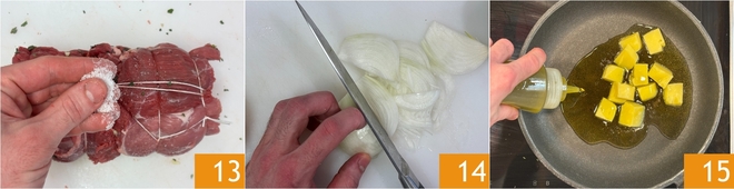 Salad la superficie 13. Ahora limpiad y cortad en rodajas las cebollas 14 y reservadlas. Derretid en una sartén la mantequilla con el aceite 15.