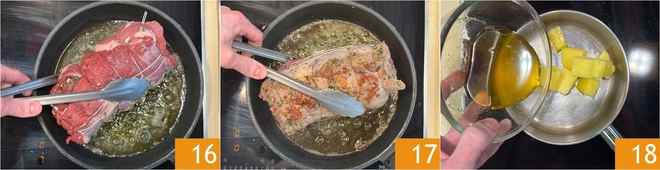 Colocad aquí el cordero enrollado 16 y doradlo a fuego medio por todos los lados durante 5 minutos en total hasta que esté dorado 17. Tras dorar la carne, preparad la mantequilla de hierbas: en un cazo verted la mantequilla y el fondo de cocción del cordero 18 y dejad que se funda suavemente.