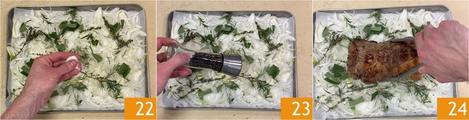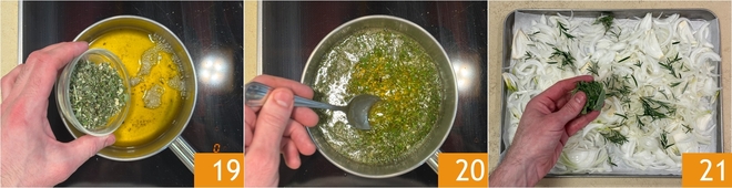 Aromatizad con las hierbas aromáticas y el ajo picados 19, luego apagad el fuego y dejad en infusión a temperatura ambiente 20. Forrad con papel de horno una bandeja y repartid aquí las cebollas y las hierbas aromáticas 21.
