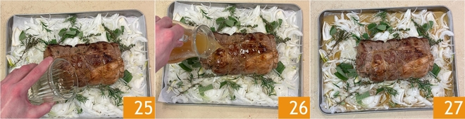 Rociadlo con el vino blanco 25, verted el caldo tanto sobre la carne 26 como sobre las cebollas 27.