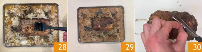 Cocinad en horno precalentado a 180C en modo ventilado durante unos 60 60–80 minutos, cuidando de girar la carne a mitad de la cocción. Pasados los primeros 20 minutos, empezad a pincelar la superficie con la mantequilla de hierbas 28, repitiendo la operación cada cuarto de hora aproximadamente. Si veis que el fondo se queda demasiado seco, añadid más caldo o agua caliente para mantener las cebollas tiernas y caramelizadas. Una vez listo, sacad del horno 29, cubrid la pierna con papel de aluminio y dejadla reposar 10–15 minutos antes de quitar el hilo 30.