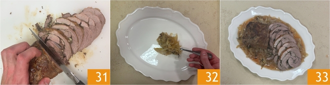 Cortad en rodajas el rollo 31 y servidlo en una fuente colocando en la base las cebollas recalentadas con el fondo de cocción 32. 1El cordero relleno está listo para llevar a la mesa 33!