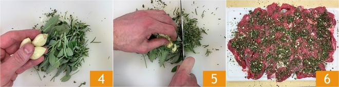 Picad el ajo junto con el romero, la salvia y el tomillo 4 5. Espolvoread el cordero con este picadillo 6.