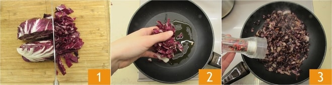 Para preparar los cordon bleu con Asiago DOP y radicchio, lo primero que debes hacer es ocuparte del radicchio: córtalo en 4 y luego en tiras 1. Ponlo en una sartén con un poco de aceite 2 y cocínalo durante unos diez minutos para que se dore bien. Al final de la cocción, sala y pimienta 7.