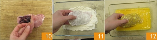 Cubre con más radicchio, coloca encima otra loncha de lomo 10, asegurando bien los bordes. Empana el cordon bleu pasándolo primero por harina 11, luego en el huevo batido 12.