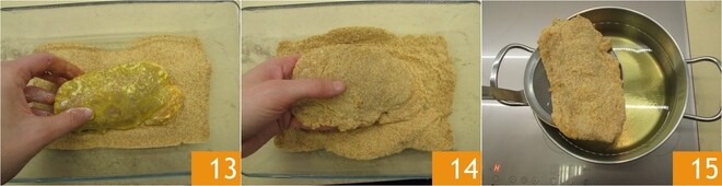 Finalmente, pásalos por el pan rallado 13. Presta atención a esta operación, sellando bien todos los bordes 14 para que no se abran durante la fritura. Prepara así todos los demás. Ahora ocúpate de la fritura. Sumerge un cordon bleu a la vez en abundante aceite precalentado a 170° 15.