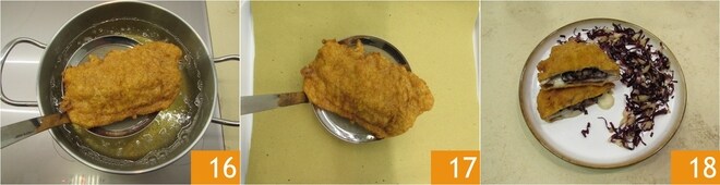 Fríelos durante unos minutos hasta que estén bien dorados y homogéneos. Escurre el cordon bleu 16 y colócalo en una bandeja con papel para fritos 17. Prosigue de esta manera cocinando también los demás. Sirve tus cordon bleu calientes, acompañándolos con una ensalada de radicchio crudo 27.